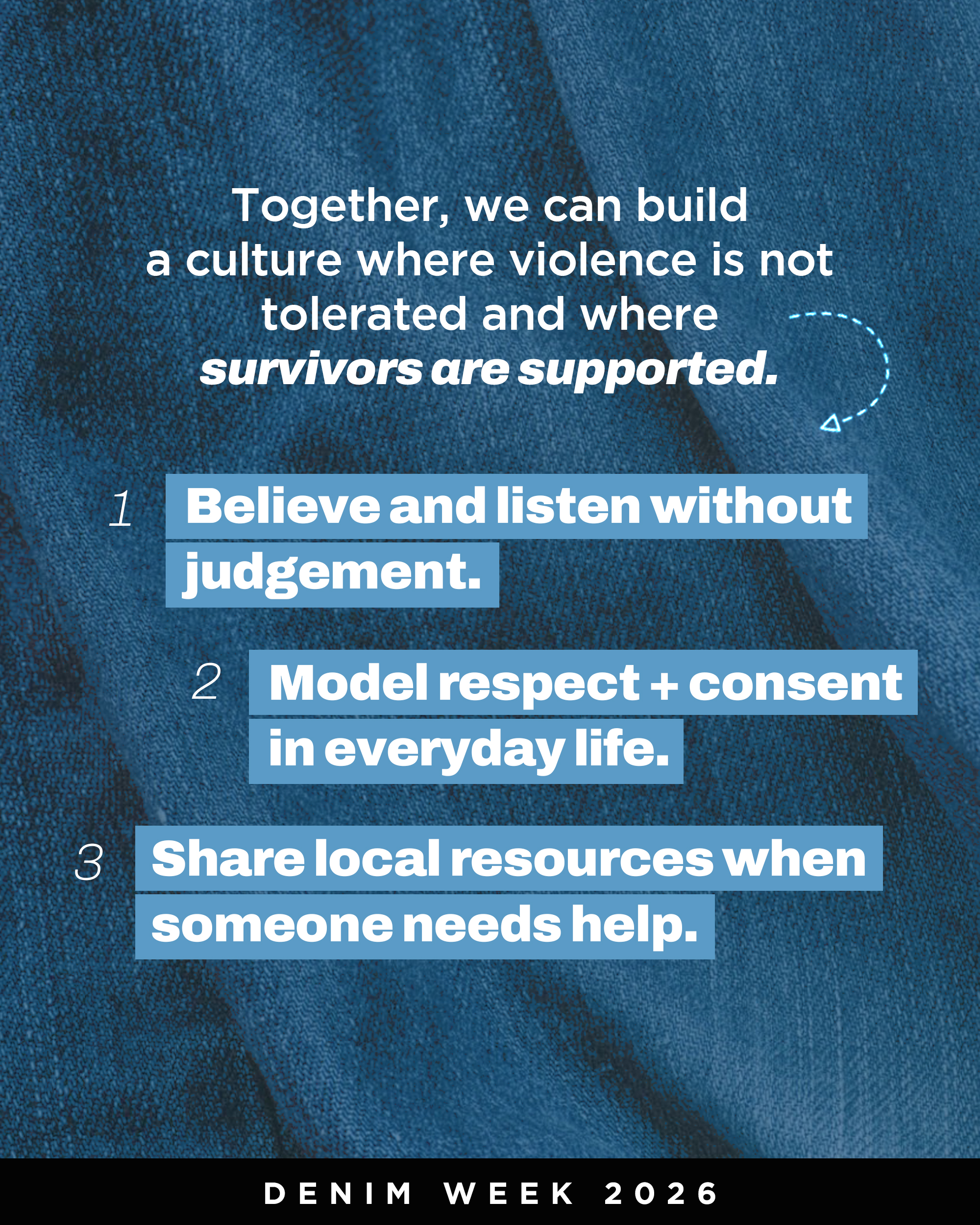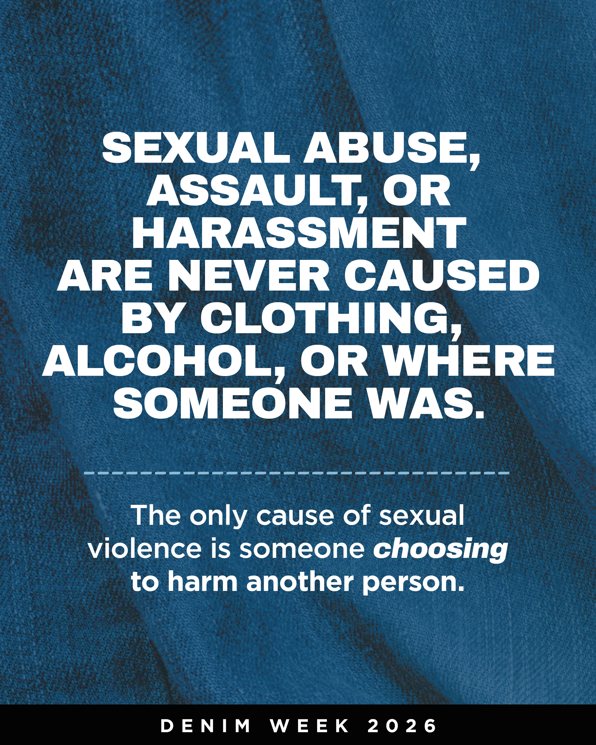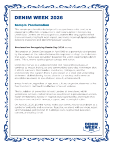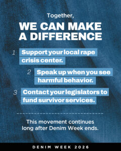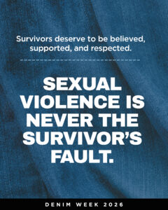 Denim Week is an opportunity for advocates, organizations, and community members to learn, speak out, and take action. Together, we can transform awareness into meaningful change for survivors and future generations.