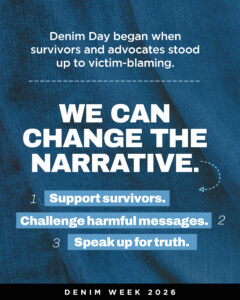 Denim Week is built around daily themes that help deepen understanding, challenge harmful narratives, and inspire action. Explore each day’s focus and join communities across the country in showing support for survivors and advancing prevention.