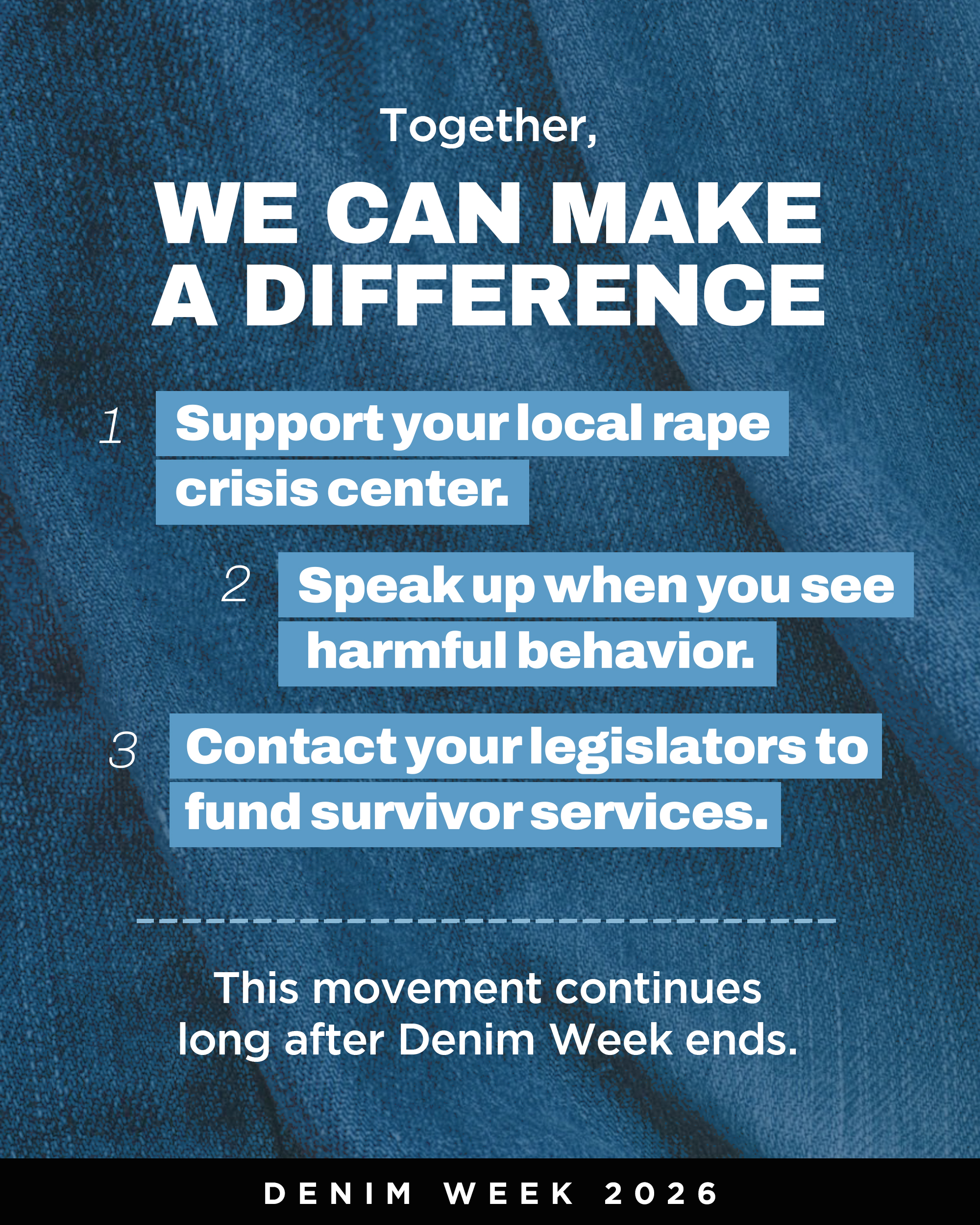 As Denim Week wraps up, the momentum keeps going! Showing up for survivors can look like so many things. It can mean listening, learning, speaking up, or simply being there. We must recognize that this is a systemic issue that requires all of us. Every action, big or small, helps create a more supportive and respectful world.
