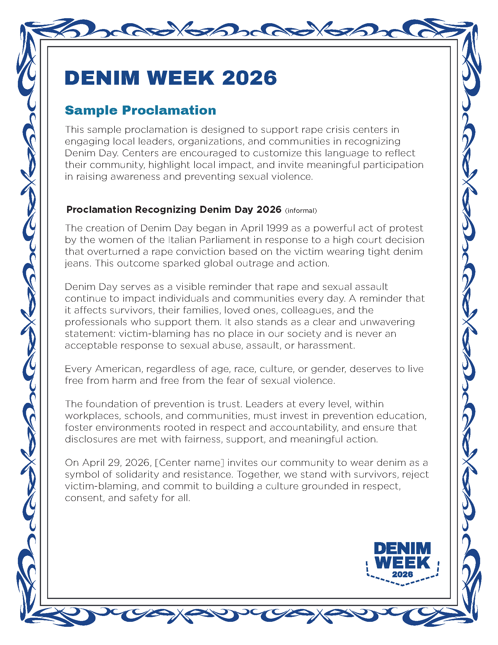 [Center Name] invites you to wear your denim on Wednesday, April 29, as a visible statement of solidarity and support. Stand with survivors. Start conversations. Be part of the movement.