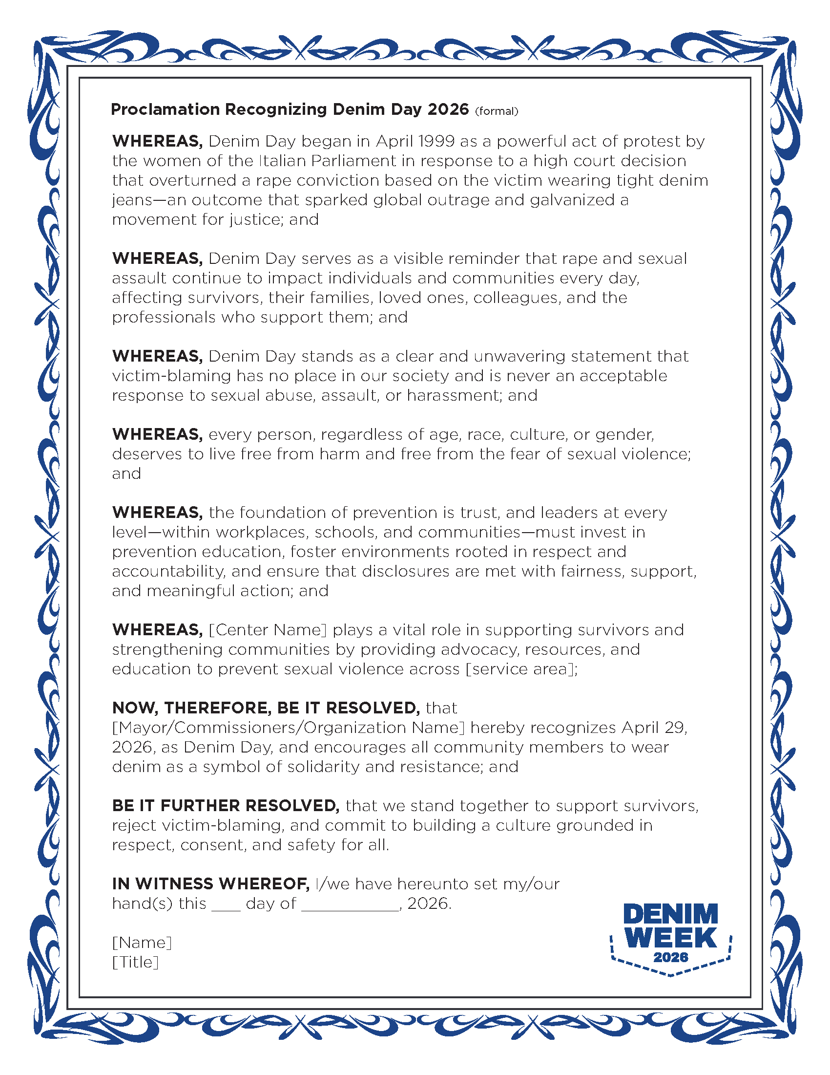Created in April 1999, Denim Day began when the women of the Italian Parliament protested a high court decision that overturned a rape conviction because the victim was wearing tight denim jeans. This act of victim-blaming sparked international outrage and ignited a movement that continues to this day. Now recognized each year on the last Wednesday of April, Denim Day is a powerful reminder that what someone wears is never consent.