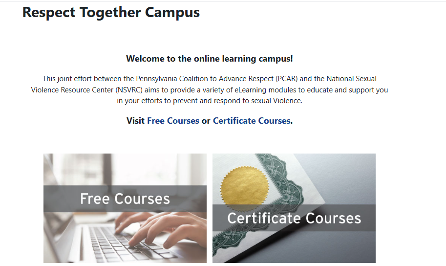 Respect Together, through our national division, the National Sexual Violence Resource Center (NSVRC) and state division, the Pennsylvania Coalition To Advance Respect (PCAR), has been proud to educate and spread awareness about the many dimensions of sexual violence over the past 50 years. When we began, we were determined to become an organization to which advocates, preventionists, survivors, and allies near and far could connect. Through launching a variety of projects, we have been able to do just that. One of our projects, the Respect Together Online Learning Campus, has proven to be useful, educational, and evergreen. We generally have over 10,000 enrolled participants at any given time, and many respondents have given us positive feedback about individual courses and the campus as a whole.